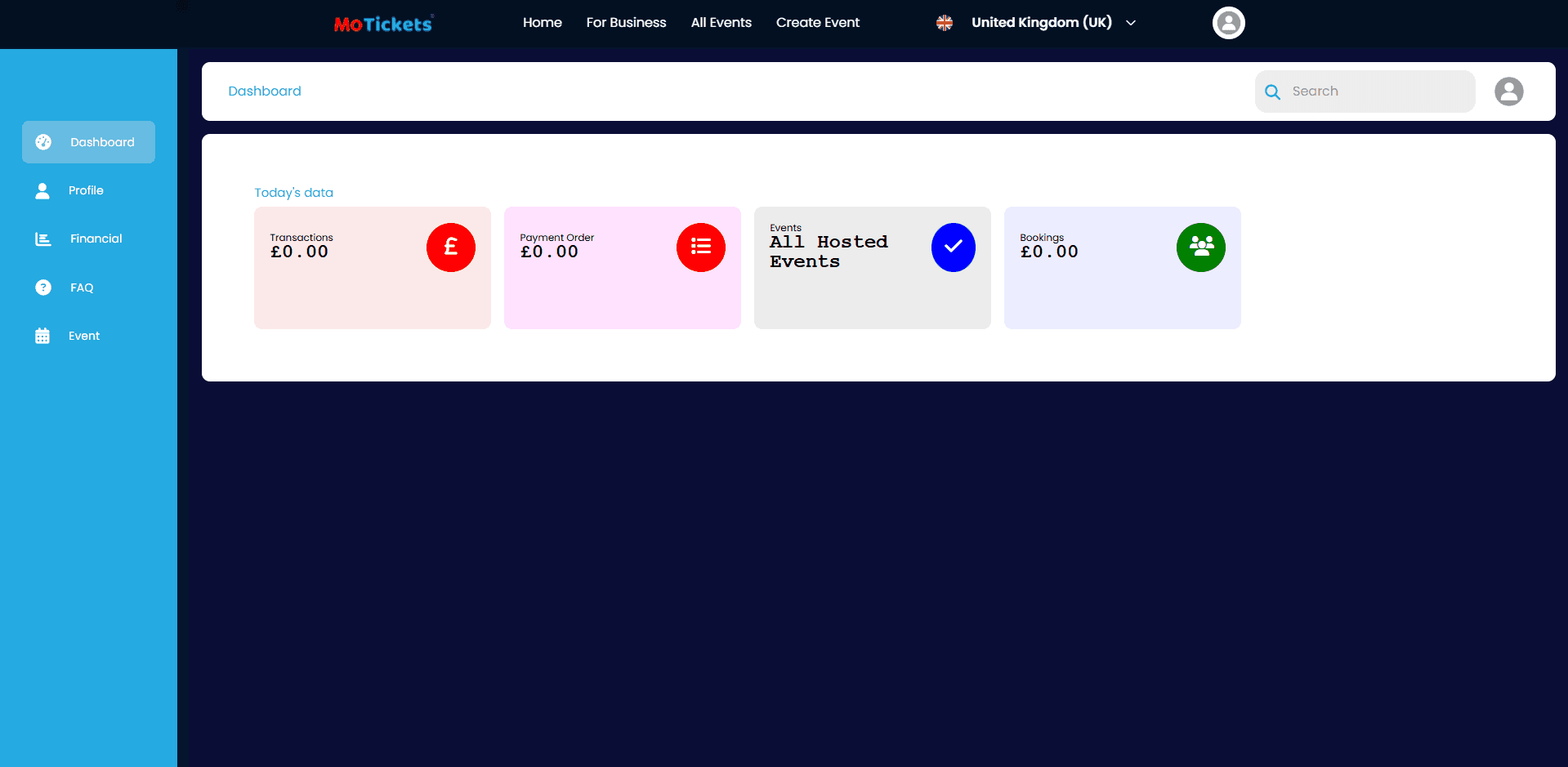 MOTICKET EXISTING WEBSITE DASHBOARD SCREEN